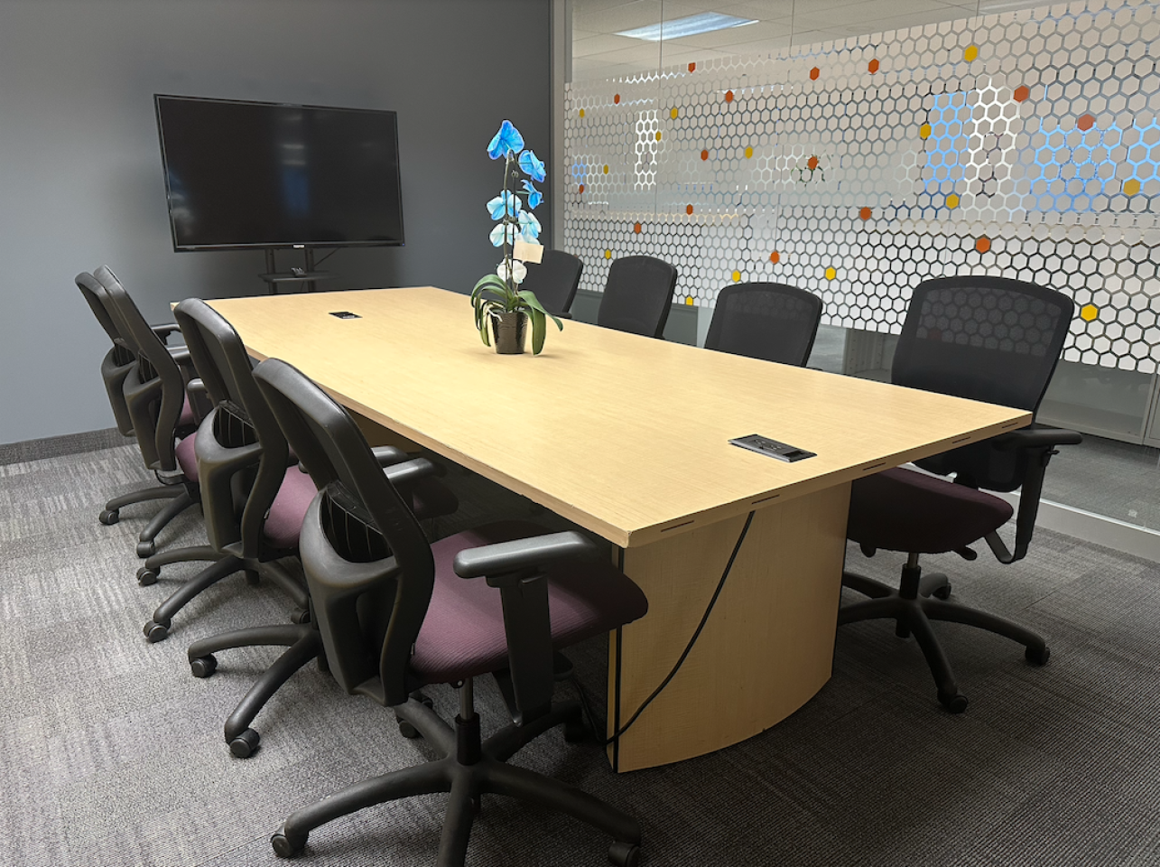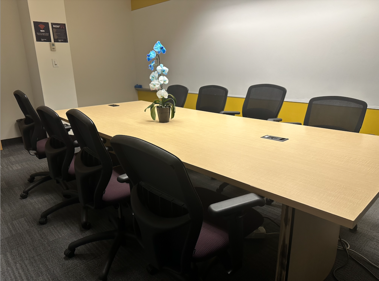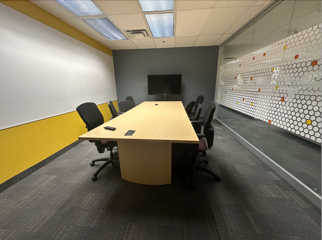The Vanguard Room at Curators Hub is a streamlined and functional boardroom ideal for focused meetings and team collaborations. It features a large, light wood conference table surrounded by comfortable black office chairs, providing ample seating for group discussions. The room is accented with a bold yellow wall and a full-length whiteboard, perfect for brainstorming or visual planning sessions. A glass wall lets in natural light and connects the space to the rest of the hub, while the modern, understated décor creates an environment designed for productivity and clear thinking.