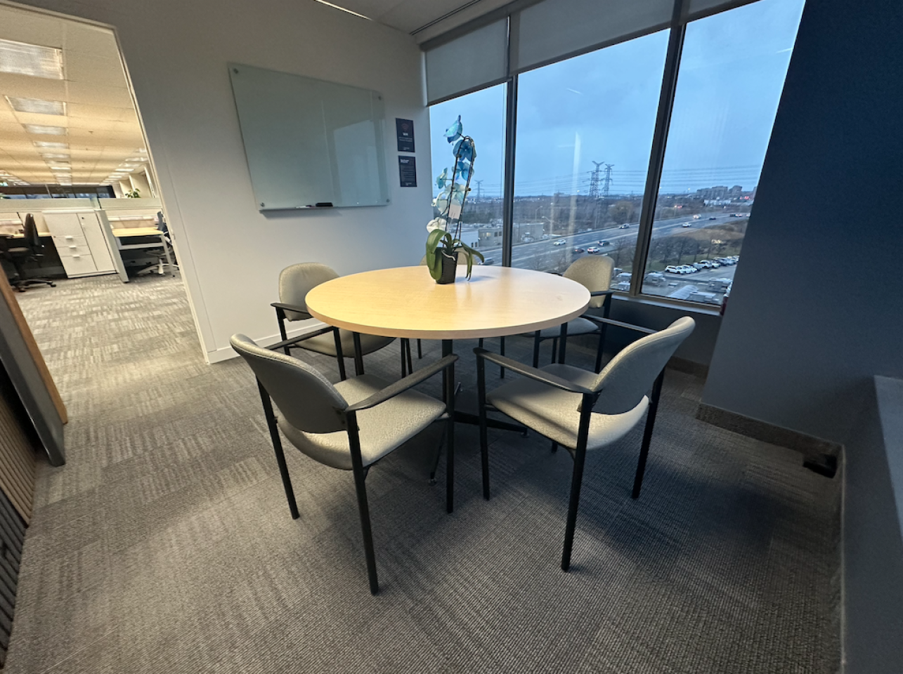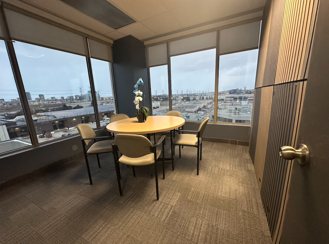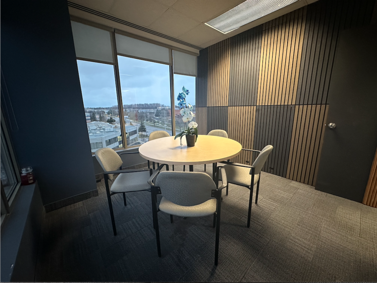 The Focus Room at Curators Hub is a cozy, sunlit space designed for private conversations, interviews, or deep work sessions. With large windows providing plenty of natural light and panoramic views, the room is furnished with a compact round table and elegant wooden chairs, creating an inviting atmosphere for small group discussions. A mobile whiteboard adds functionality for planning or brainstorming, making The Focus Room ideal for focused, distraction-free collaboration.