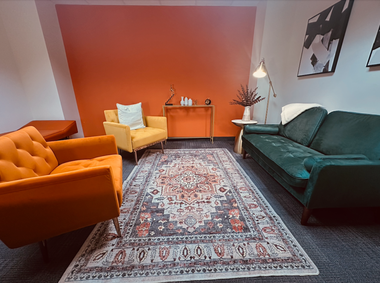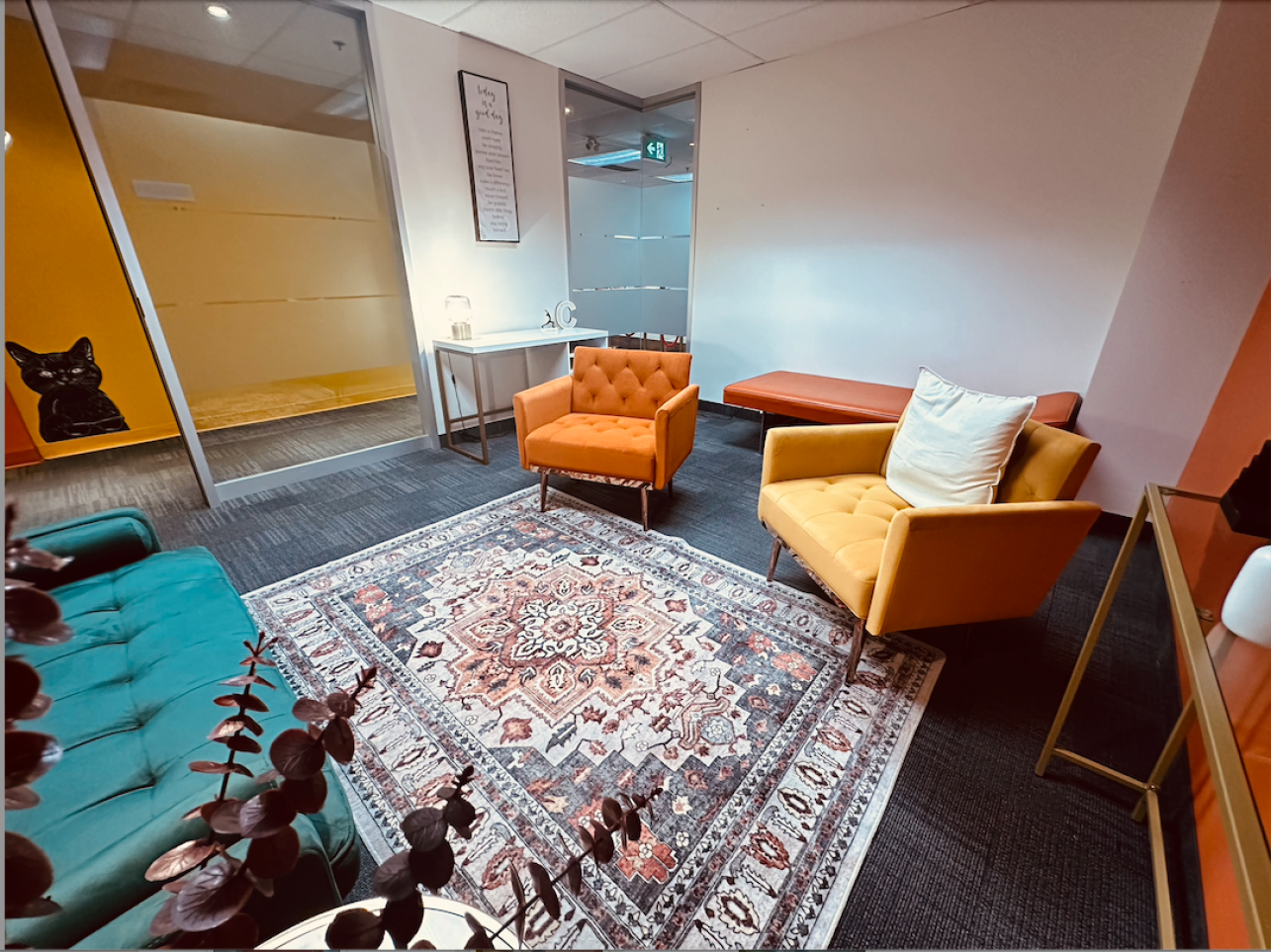 The Coaching / Flourishing Room at The Curators Hub is perfectly tailored for private therapy, coaching, or counselling sessions with 2–4 people. This intimate, stylish space features vibrant mid-century seating in emerald, mustard, and orange tones, complemented by a soft area rug and modern decor for a comfortable, welcoming feel. Designed to foster meaningful conversation and reflection, the layout and gentle lighting create a relaxed atmosphere ideal for focused one-on-one or duet client work. Whether you’re meeting with clients for therapy, coaching, or confidential consultation, the Flourish Room offers a professional, cozy environment to support personal growth and well-being.