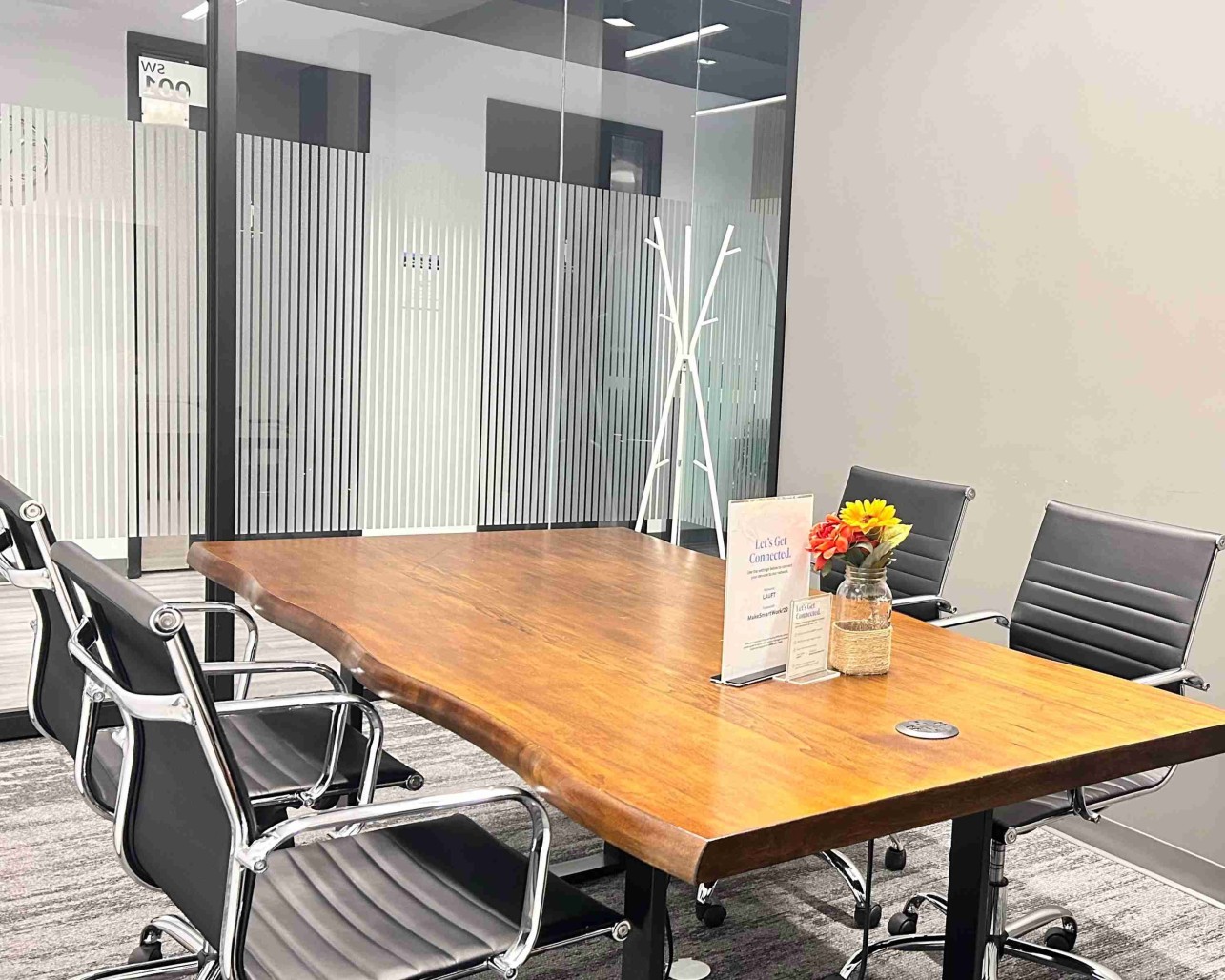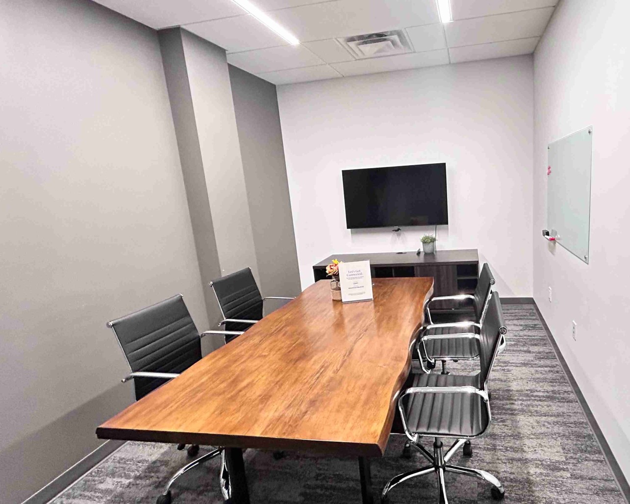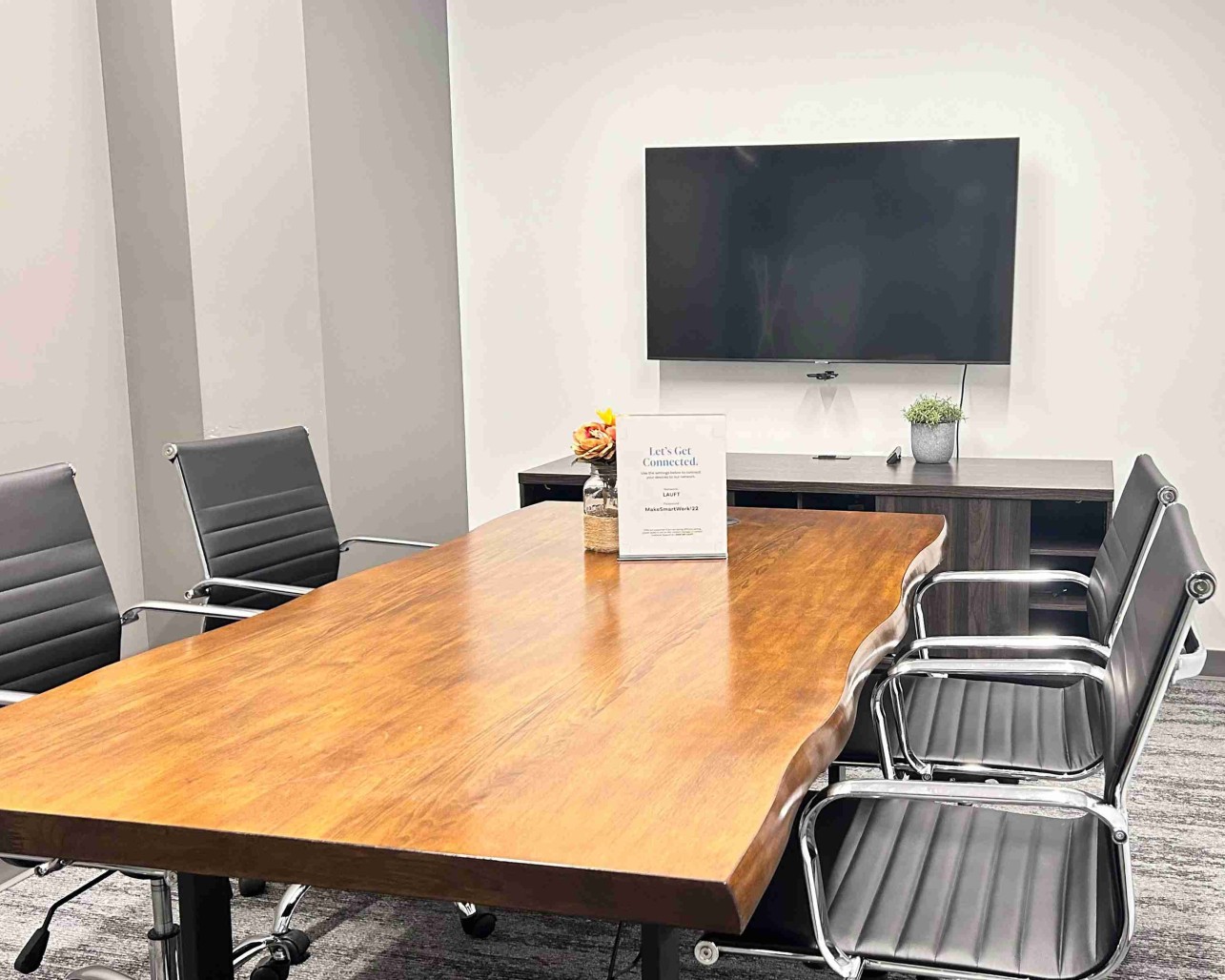 Collaborate + Huddle Designed for: 4-6 people A private workroom built for presentations, collaborations, ideation and video conferencing. Outfitted with a 4K Smart TV screen, glass whiteboard and the JABRA Panacast video camera for perfect conferencing.