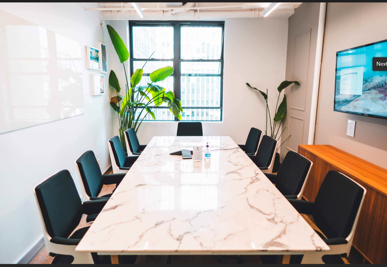 Conference Room A. Includes privacy film, wifi, phone, kitchen, cafe, and outdoor terraces. Central midtown location. Hours are 9am-5pm, 7 days a week. Can add 4 seats, max capacity is 10 people. Perfect for board meetings, start-ups, satellite companies, investor meetings, hackathons, and additional business needs.